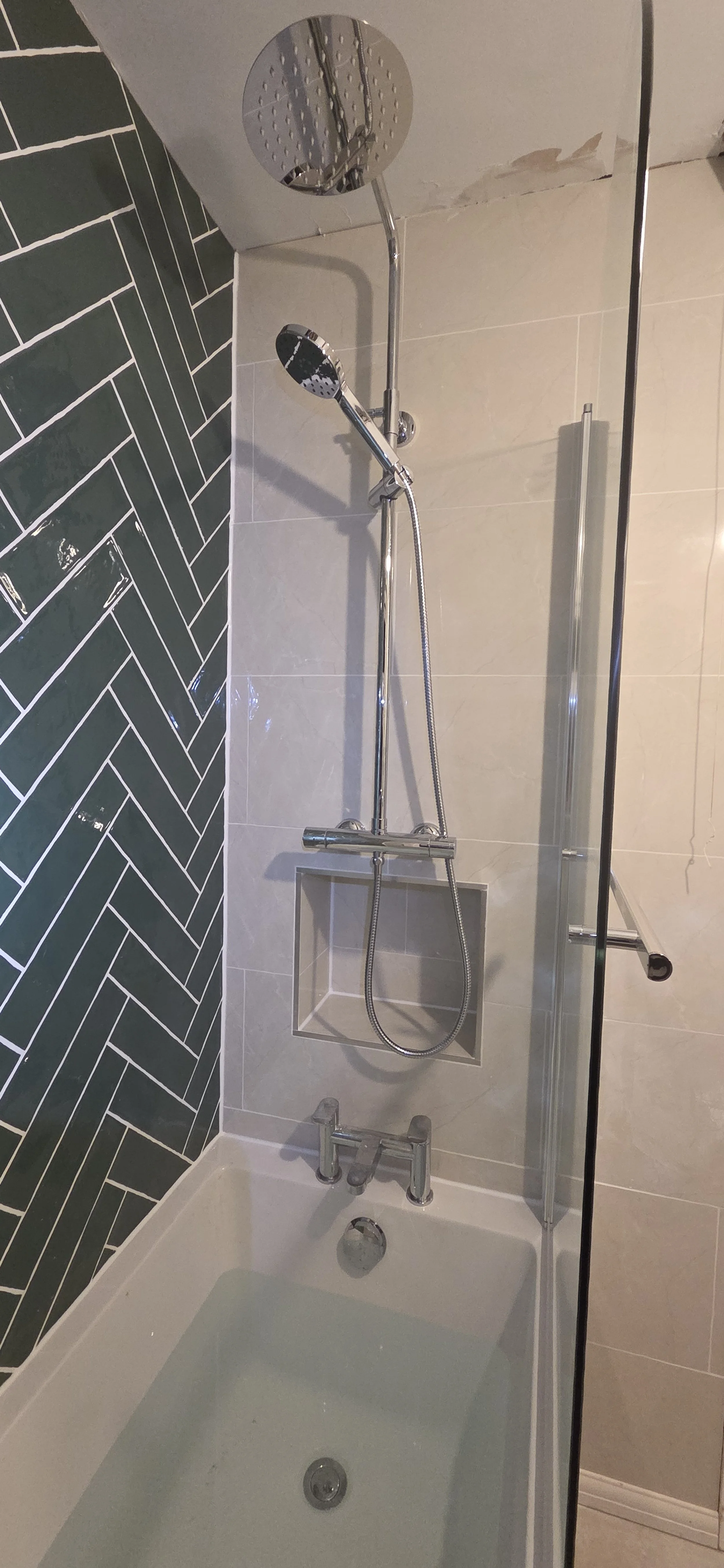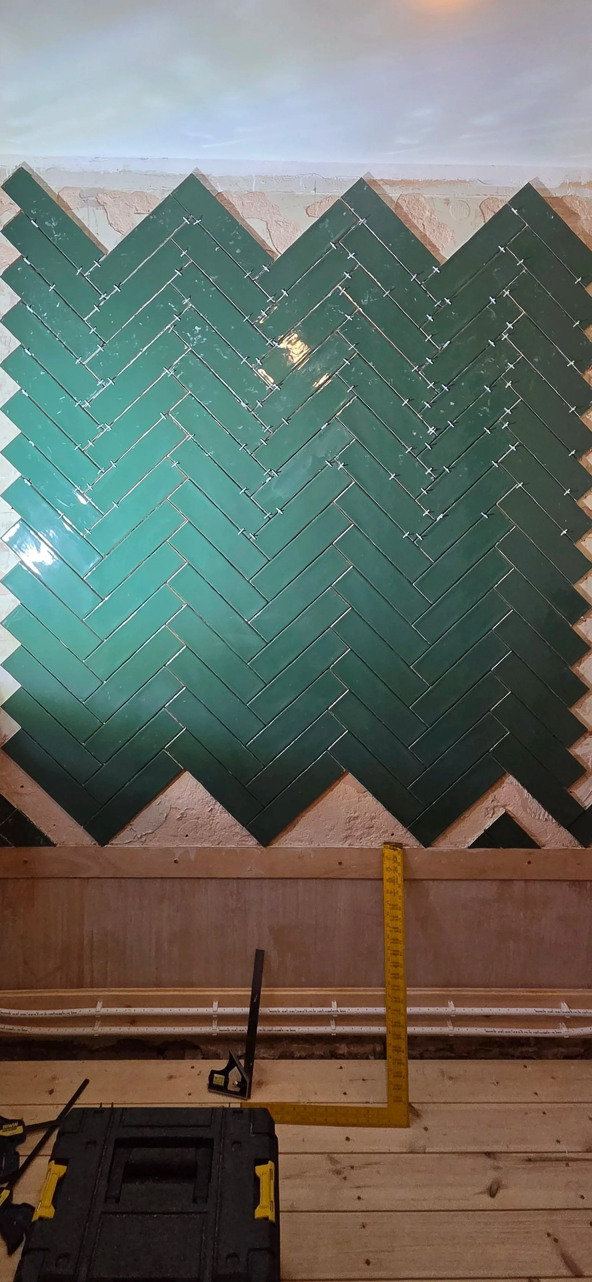 Work in progress here where the Client asked for a herringbone pattern feature tiled wall in their bathroom