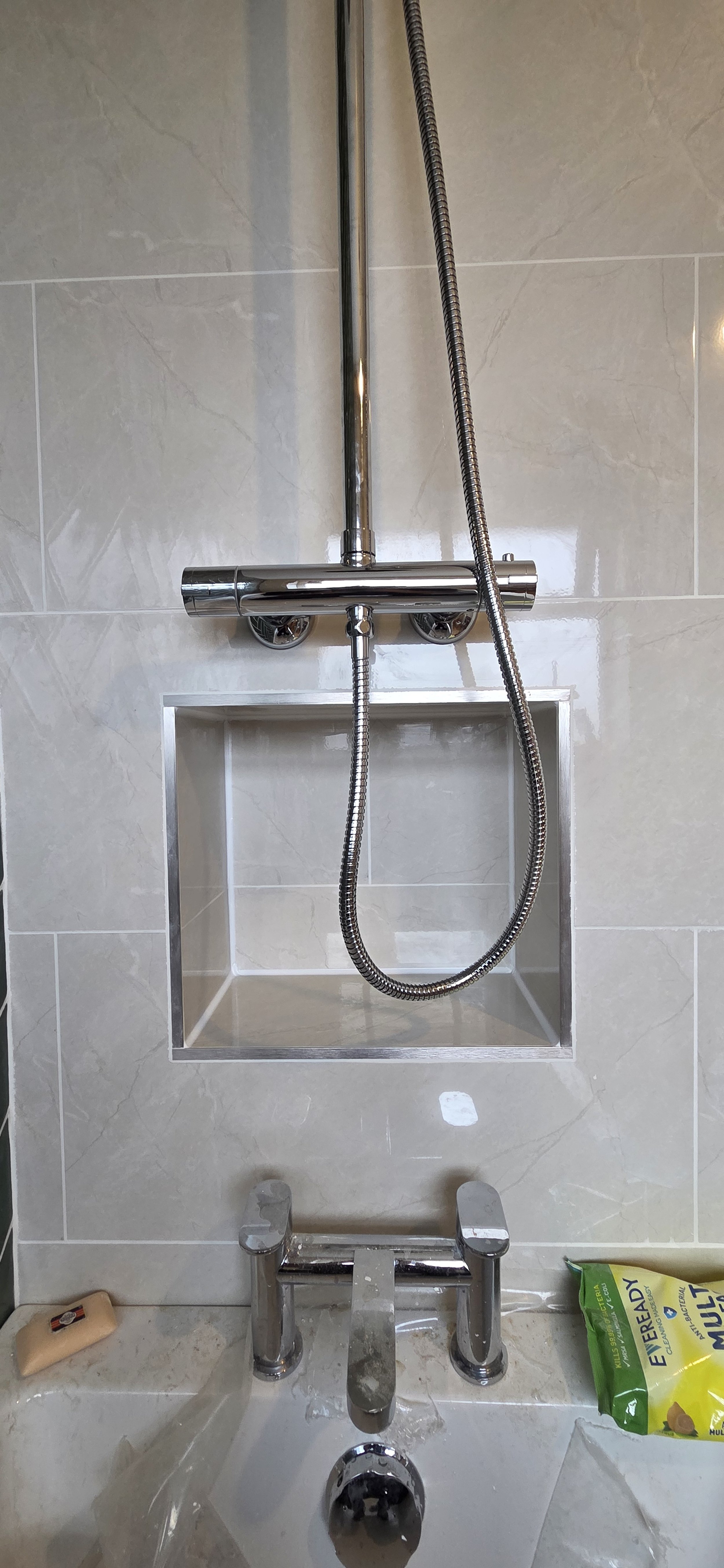 Our precision being shown in these images of a shower niche, some door handles, a television wall mount and a small book-shelf being installed